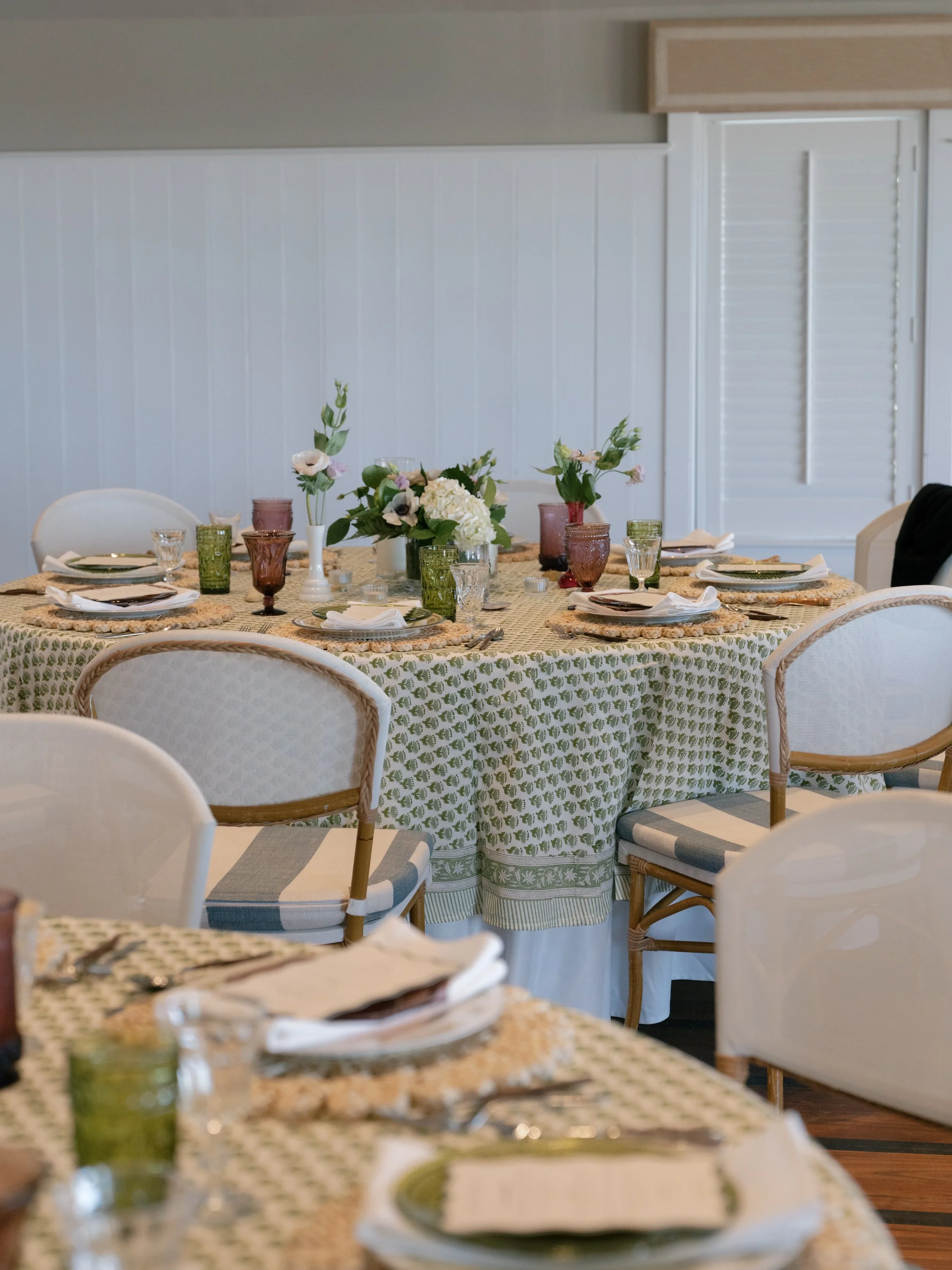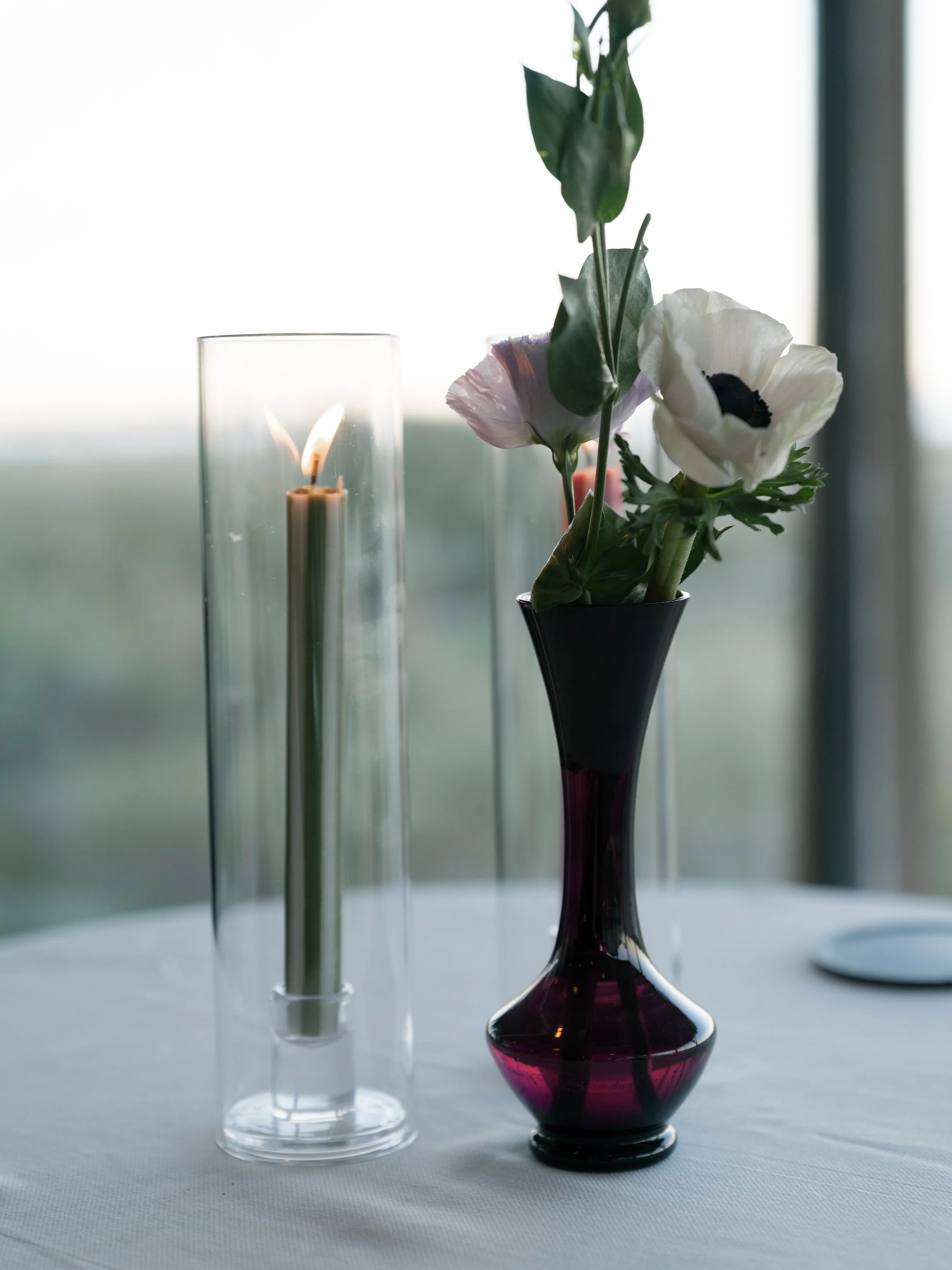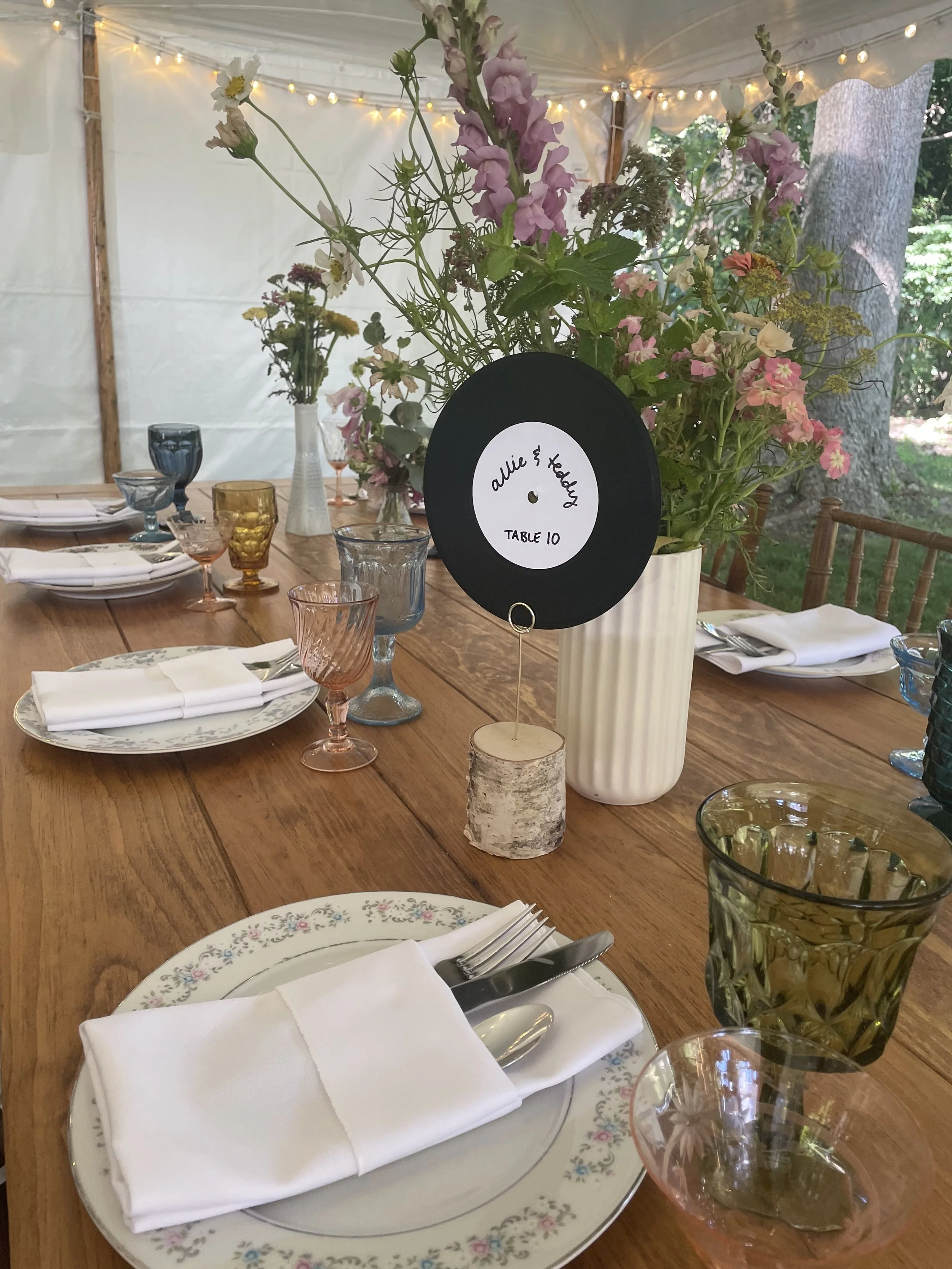 Nifty provided floral china dinner plates, a mix of green and amethyst salad plates, green and amethyst goblets, vintage clear wine glasses, mix-and-match flatware, and bud vases with an array of hurricane candles and votives. The result was a romantic seaside dream.
