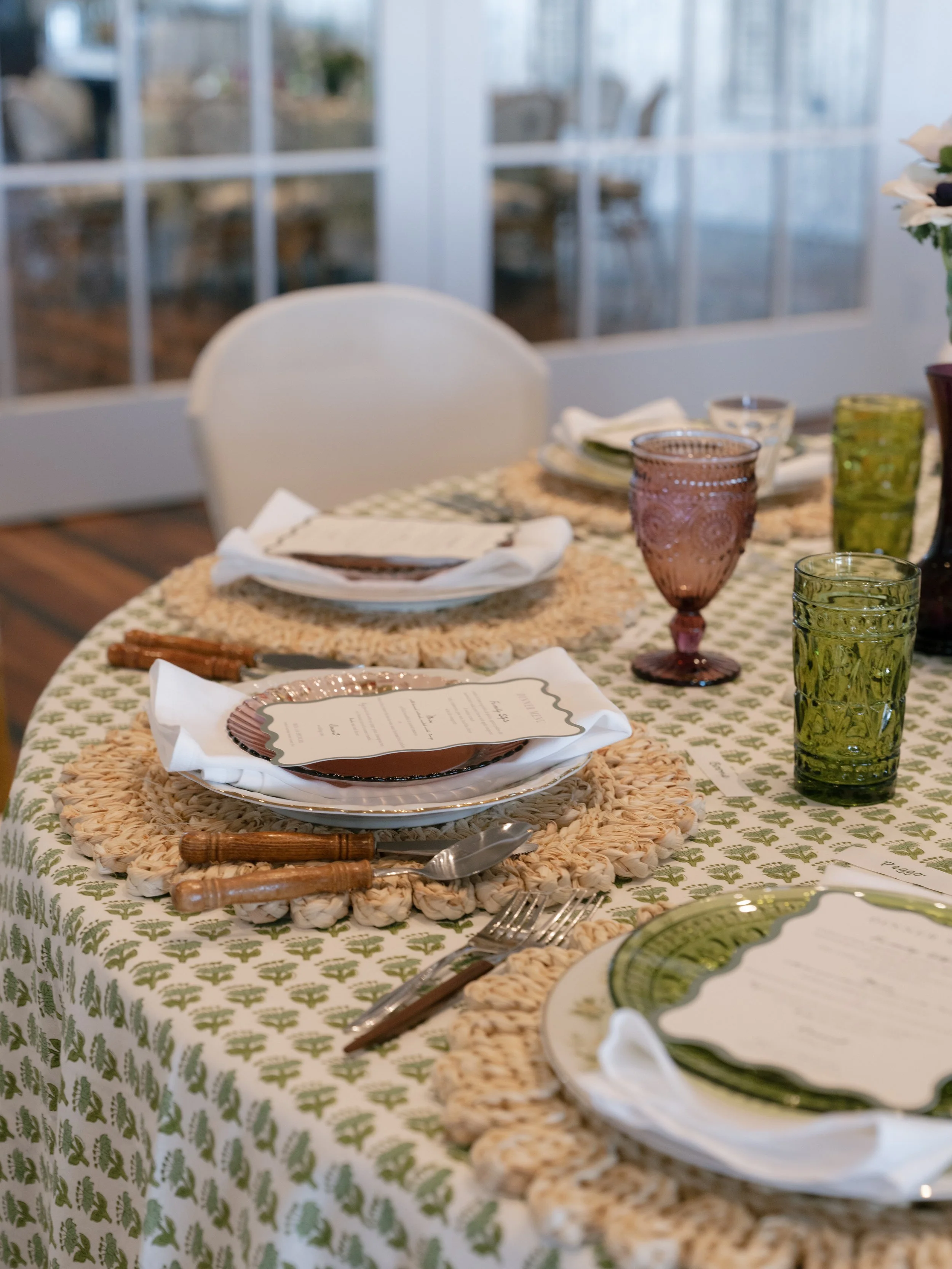 Spencer knew she wanted to honor the beautiful fall day, but decided to use non-traditional fall colors. She decided on green and amethyst, which blended beautifully on top of the fun tablecloths she purchased for the day.